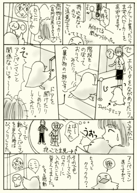 ・ショーの時間に注意。一階の劇場で、アンパンマンのショーが行われます。どうも時間が定まっていないようなので、初めにスタッフさんに聞いておくといいと思います。一階まで来てみたけれど、ちょうどショーが終わっちゃってて、見れないor待つハメになった・・・ということになりますから。近くで「ショー」を見れる方(遊園地とかでもありますよね)は必要ないかもしれませんが、アンパンマンが本当に出てきて、挨拶したり、動いたりするのは、子供にとっちゃーものすごいことだと思うので、ぜひ見せてあげたいトコです。怖がるかもしれませんが(^_^;)