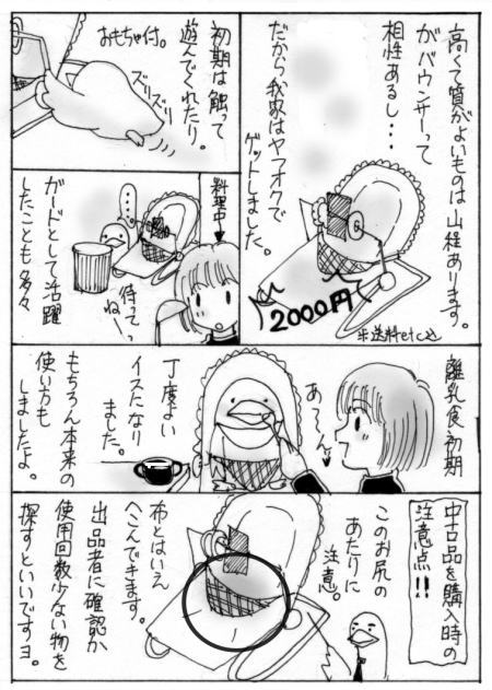 それよりも問題は、マンガにもあるように、「お尻部分が何だかへこんでくる」ってことです。7.8kgこえてくると、赤ちゃんも重いです。毎日のように使い、その上でお尻ブンブンなんて動かれてたら、布とはいえ、ビローーンとした感じになってきます。