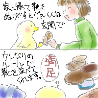 とても・・・努力の跡が残る・・・靴たちなんですが・・・何故これとこれの間にこれがっつーか、右左逆はデフォルトなんですよね・・・とか・・・。お客様が来た時に恥ずかしいと思いつつ、息子の芸術作品を触れないでいる私です。