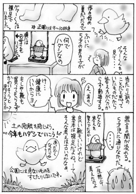 ちなみにマンガにもありますが・・・基本の基本は裸足なのかなぁとも思います。最近は危険物も多いし、なんたって寒かったし、難しいかもしれませんが。まだそんなに歩かない時期だからこそ、危険度も低いと思うので、「足の裏から自然の感触」を教えてあげるのもいいのでは・・・と思います。(地域の子育て支援者さんの言ってたセリフなんですけどね(^_^;))